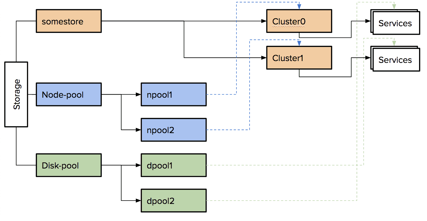 - логические объекты - конкретные СХД (somestore), составленные из кластеров (Clusters) и сервисов ФС (Services pool)